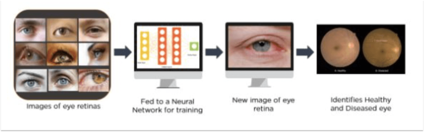 Here is an example of a neural network that uses large sets of unlabeled data of eye retinas. The network model is trained on this data to find out whether or not a person has diabetic retinopathy.
